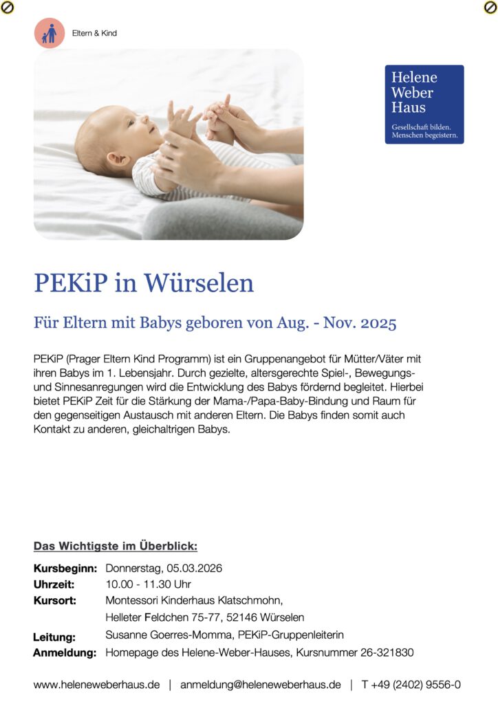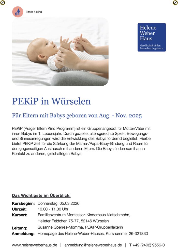 Wir freuen uns sehr, dass wir diesen Kurs gemeinsam mit unserem Kooperationspartner „Helene Weber Haus“ wieder in unserer Einrichtung anbieten können. Anmeldungen über die Homepage des Helene Weber Hauses.